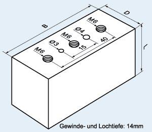Cu-Elektrodenrohling Vierkant mit Bohrbild nach System EROWA 3 Gewinde 2 Stiftbohrungen